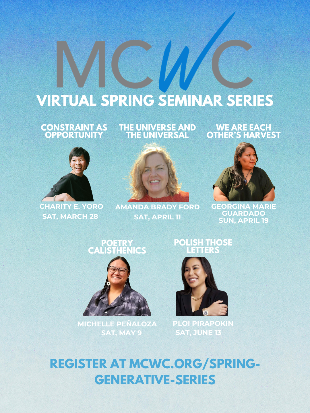 These seminars were developed in response to the demand for more MCWC programming all year round. They also constitute an important fundraiser for us to support our in person summer conference, so please spread the word about this series. Every registration helps us continue creating meaningful, prestigious, and high-quality literary programming for our community. We appreciate your support!